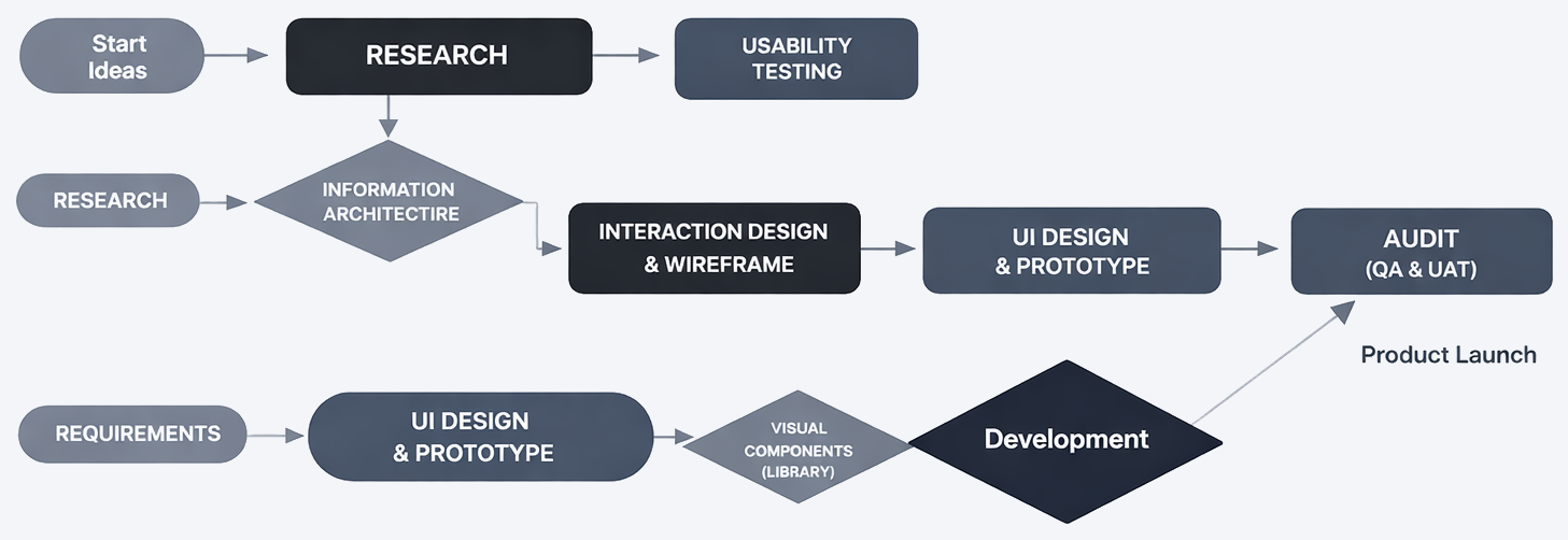 - Scope, architect, wireframe (Figma & Axure), design (Photoshop & Sketch) and launch and present UX designs
